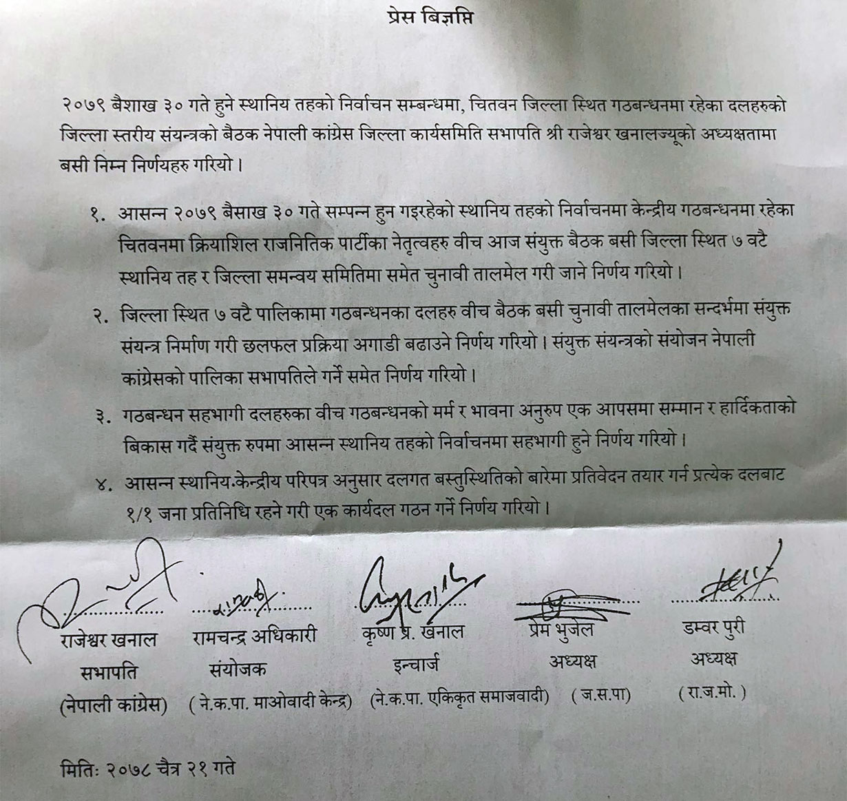 ‘आसन्न २०७८ वैशाख ३० गते सम्पन्न हुन गइरहेको स्थानीय तहको निर्वाचनमा केन्द्रीय गठबन्धनमा रहेका चितवनमा क्रियाशील राजनीतिक पार्टीका नेतृत्वहरुबीच आज संयुक्त बैठक बसी जिल्लास्थित ७ वटै स्थानीय तह र जिल्ला समन्वय समितिमा समेत चुनावी तालमेल गरी जाने निर्णय गरियो’, जारी संयुक्त विज्ञप्तिमा भनिएको छ ।