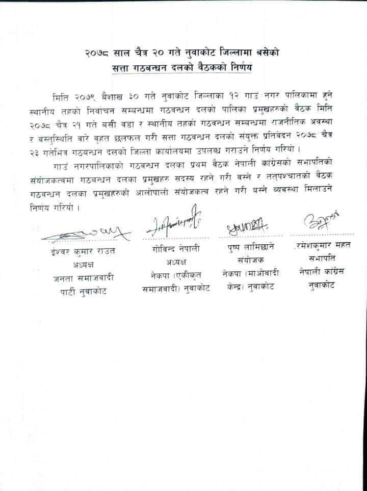 ‘स्थानीय तह निर्वाचनका सम्बन्धमा गठबन्धन दलको पालिका प्रमुखहरुको बैठक मिति २०७८ चैत्र २१ गते बसी वडा र स्थानीय तहको गठबन्धन सम्बन्धमा रानजीतिक अवस्था र वस्तुस्थिति बारे बृहत् छलफल गरी सत्ता गठबन्धन दलको संयुक्त प्रतिवेदन २०७८ चैत्र २३ गतेभित्र गठबन्धन दलको जिल्ला कार्यालयमा उपलब्ध गराउने निर्णय गरियो’ संयुक्त विज्ञप्तिमा भनिएको छ ।