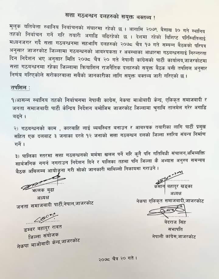 गठबन्धनको काम, कारबाहीलाई व्यवस्थित बनाउनका लागि आवश्यक तयारीका लागि पार्टी प्रमुखसहित एक दलबाट तीनजनाका दरले १२ जनाको जिल्लास्तरीय संयन्त्र निर्माण गर्ने, पालिकास्तरमा सत्ता गठबन्धनको मर्मविपरीत गतिविधि सञ्चालन तथा अभिव्यक्ति नदिन निर्देशन दिने र पालिकास्तरमा पनि चुनावी तालमेलको संयन्त्र निर्माण गर्ने सहमति भएको नेपाली कांग्रेसका जिल्ला सभापति वेदराज सिंहले जानकारी दिए ।