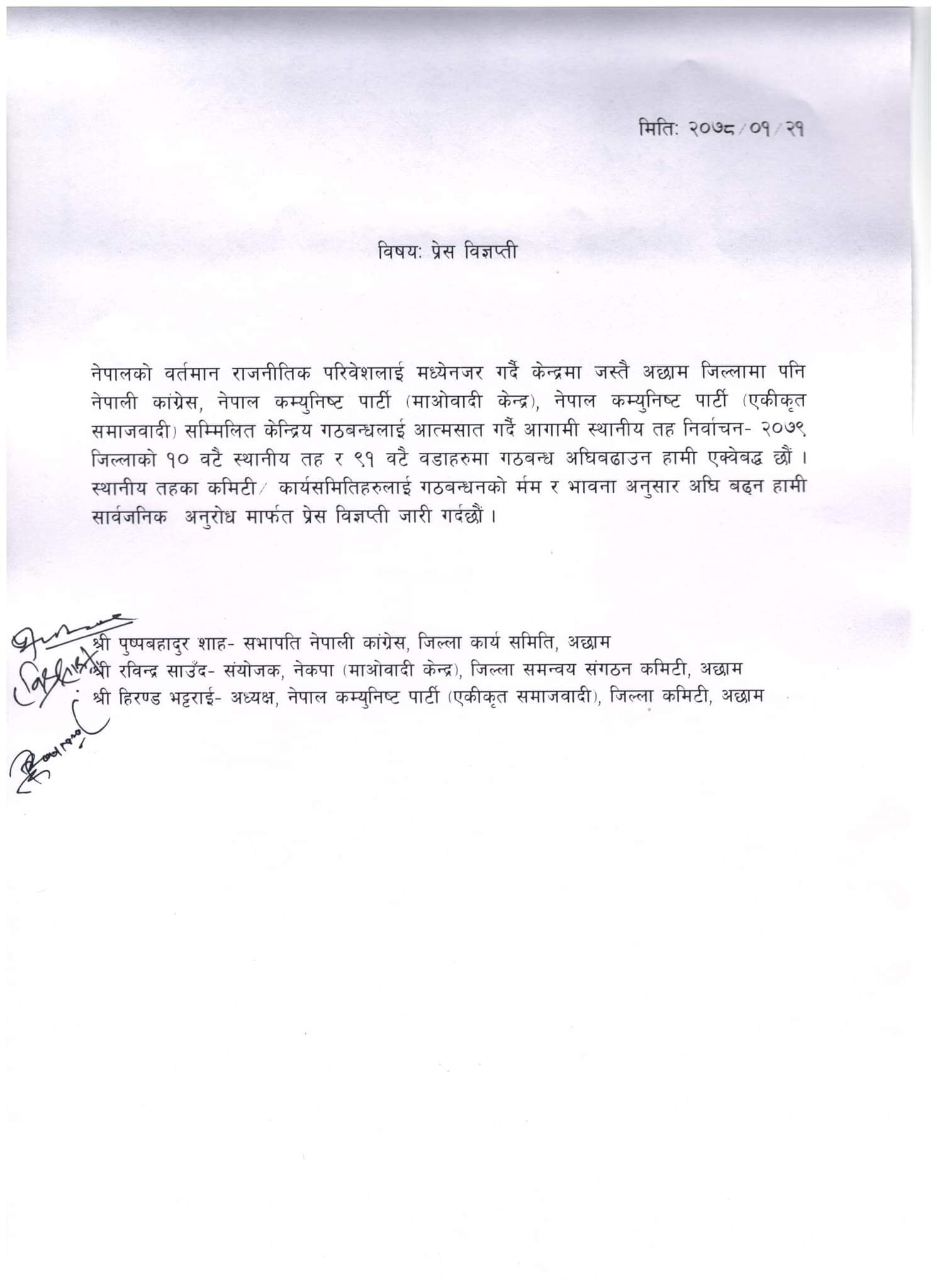 सोमबार जिल्लामा एक कार्यक्रमका बीच कांग्रेस जिल्ला सभापति पुष्पबहादुर शाह, माओवादी केन्द्रका जिल्ला संयोजक रवीन्द्र साउँद र एकीकृत समाजवादी पार्टीका जिल्ला अध्यक्ष हिरण्ड भट्टराईले निकालेको संयुक्त विज्ञप्तिमा भनिएको छ ।