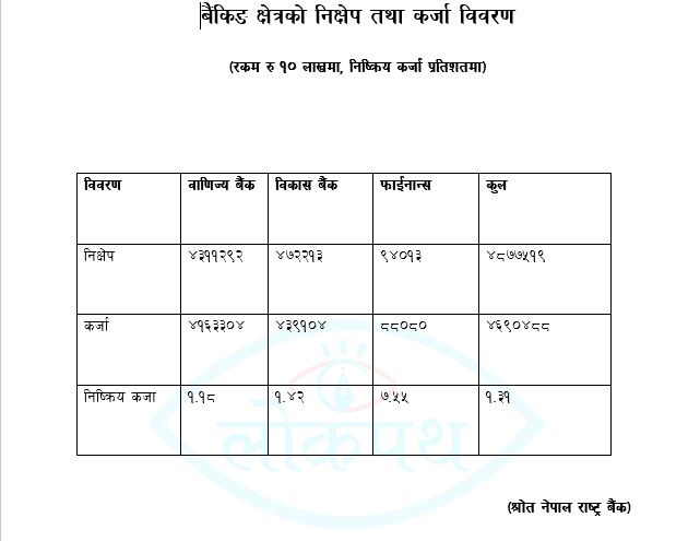 सञ्चालनमा रहेका २७ वटा वाणिज्य बैंकहरुमा मात्र भने एक दशमलव १८ प्रतिशत कर्जा निष्क्रिय देखिएको छ । पछिल्लो अवधिमा वाणिज्य बैंकहरुले ४३ खर्ब ११ अर्ब २९ करोड ९० लाख रुपैयाँ निक्षेप संकलन गरी ४१ खर्ब ६३ अर्ब ३० करोड ४० लाख रुपैयाँ कर्जा प्रवाह गर्दा उक्त अनुपातको कर्जा निष्क्रिय देखिएको हो ।