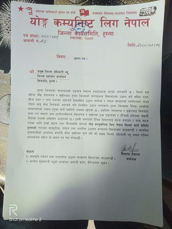 एक सातायतादेखि निजी एयरलाइन्स कम्पनटीले नियमित उडान नगरेपछि नियमित उडनको मागसहित योङ्ग कम्युनिष्ट लिग नेपाल हुम्लाले जिल्ला प्रशासनको ध्यानकर्षण गरेको छ ।