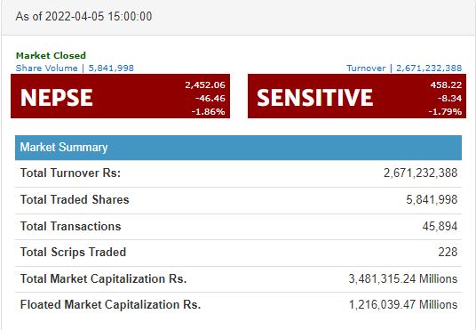 काठमाडौं । साताको तेस्रो दिन मंगलबार नेपाल स्टक एक्सचेन्ज (नेप्से) का सबै परिसूचक राताम्य भएको छ । मंगलबार नेप्से ४६ दशमलव ५६ अंकले घटेर २४५२ दशमलव ०६ विन्दुमा आएर बजार बन्द भएको छ ।