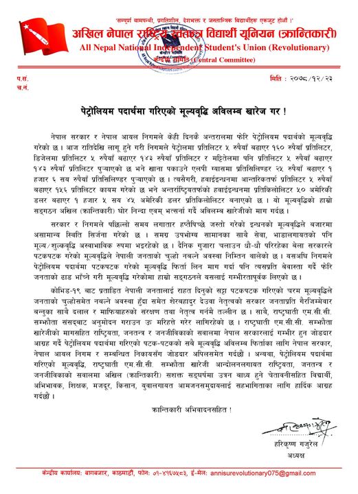 नेपाल आयल निगमले गएरातिदेखि लागू हुनेगरी मूल्यवृद्धि गरेपछि क्रान्तिकारीका अध्यक्ष हरिकृष्ण गजुरेलले विज्ञप्तिमार्फत सो माग गरेका हुन् ।