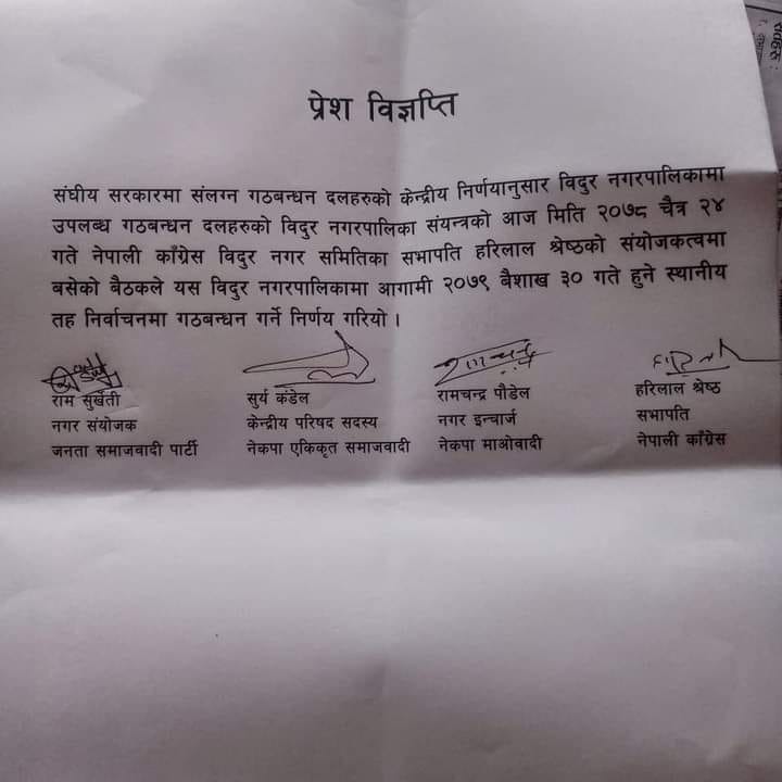 ‘संघीय सरकारमा संलग्न गठबन्धन दलहरुको केन्द्रीय निर्णयानुसार विदुर नगरपालिकामा उपलब्ध गठबन्धन दलहरुको विदुर नगरपालिका संयन्त्रको आज मिति २०७८ चैत्र २४ गते नेपाली कांग्रेस विदुर नगरसभापति हरिलाल श्रेष्ठको संयोजकत्वमा बसेको बैठकले यस विदुर नगरपालिकामा आगामी २०७९ वैशाख ३० गते हुने स्थानीय तह निर्वाचनमा गठबन्धन गर्ने निर्णय गरियो ।’ जारी संयुक्त विज्ञप्तिमा भनिएको छ ।