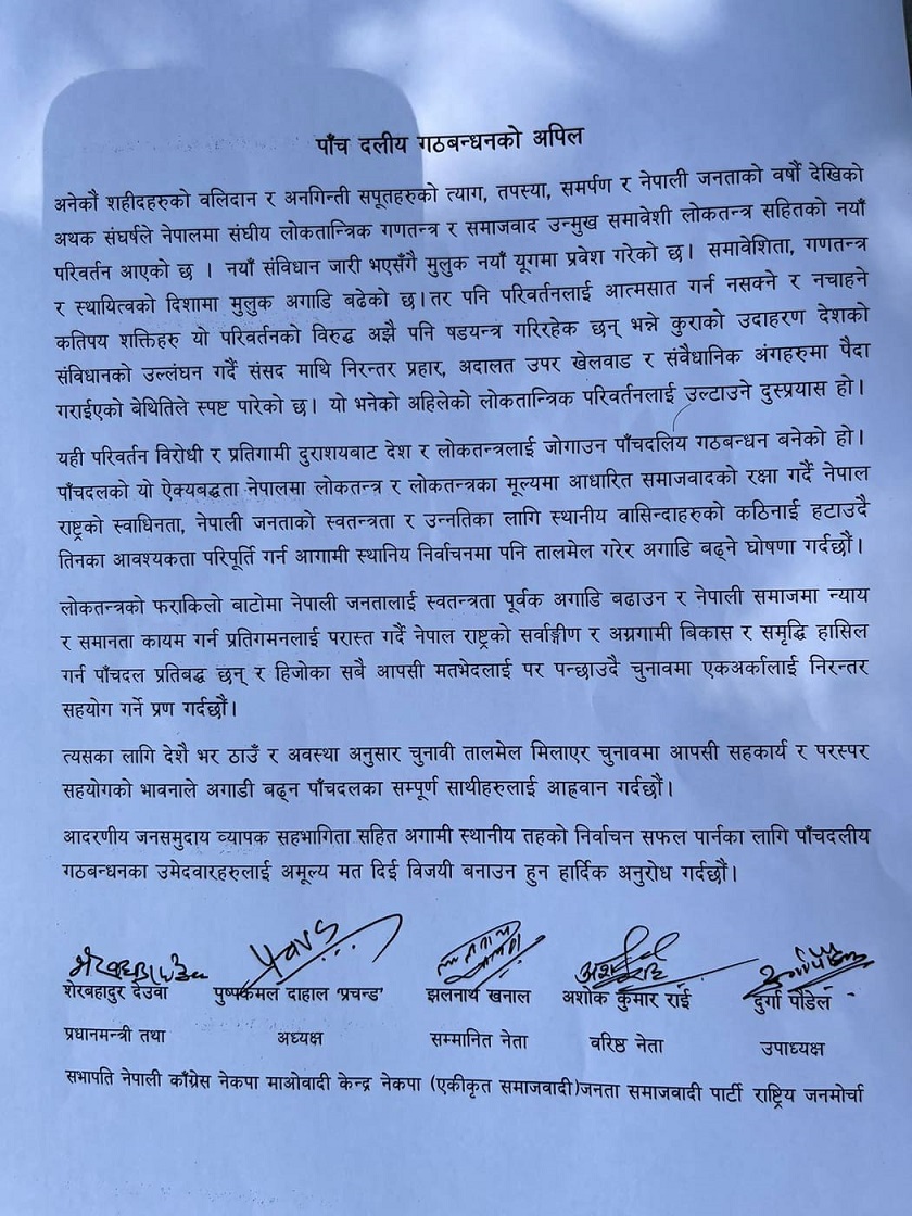 काठमाडौं । सत्तारुढ ५ दलीय गठबन्धनले आगामी स्थानीय तहको निर्वाचनमा आपसी सहकार्य र परस्पर सहयोगको भावनाका साथ अघि बढ्न आह्वान गरेको छ ।