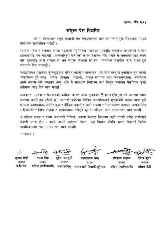 साथै उक्त विज्ञप्तिमा आर्थिक संकट र रकम अभावको निमित्त कारण देखाएर शिक्षामा घट्दै गएको बजेट मान्य नभएकाले आउने बजेटमा शिक्षा एवं विज्ञान प्रविधिजस्ता क्षेत्रलाई विशेष प्राथमिकतामा राख्न समेत माग गरेका छन् ।