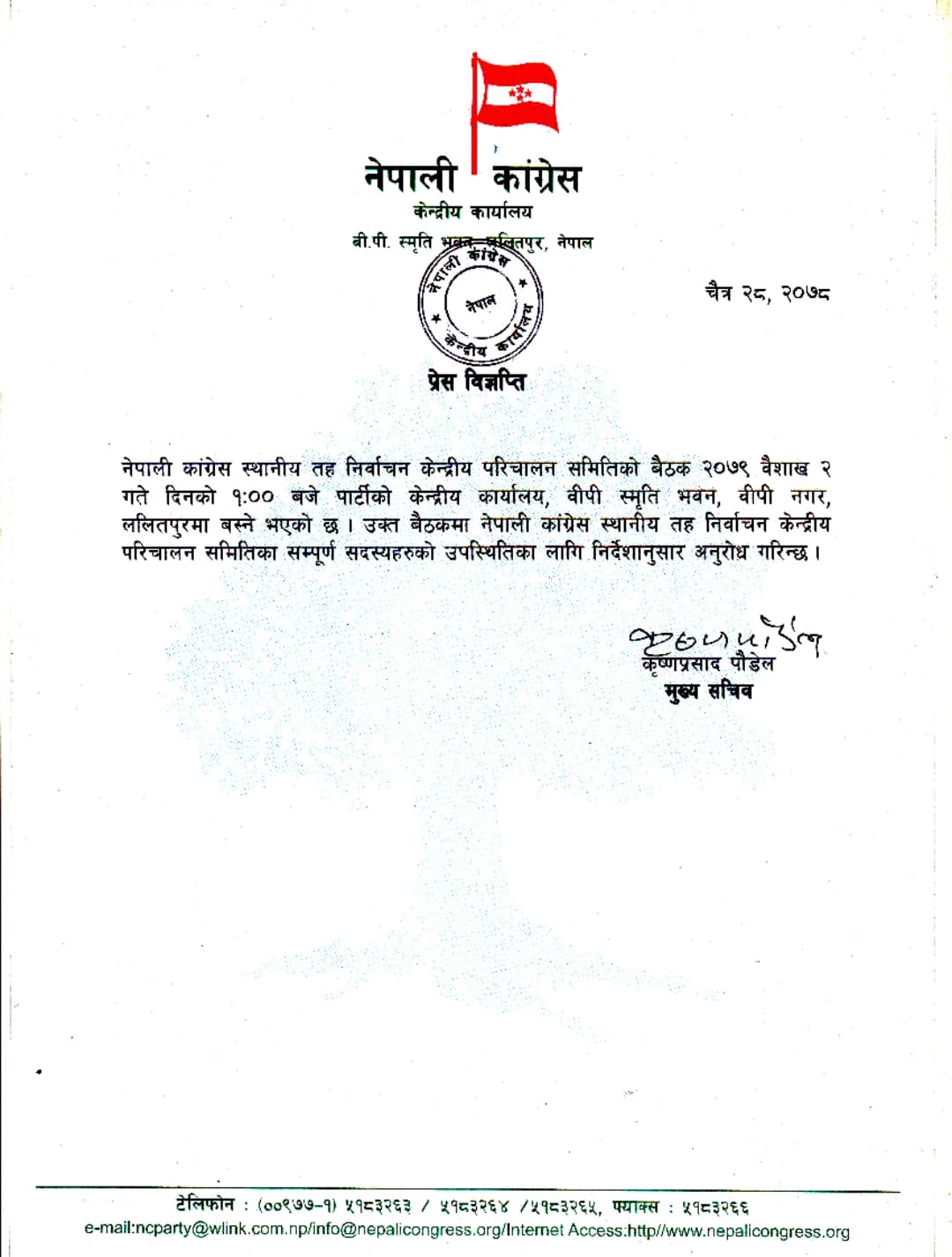 आगामी वैशाख २ गते दिउँसो १ बजे पार्टी केन्द्रीय कार्यालय सानेपामा बैठक आह्वान गरिएको मुख्यसचिव कृष्णप्रसाद पौडेलले जानकारी दिए ।