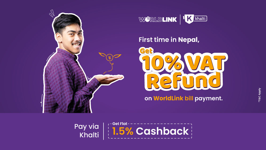 काठमाडौं । वर्ल्डलिंक प्रयोगकर्ताहरूले खल्तीमार्फत आफ्नो बिल भुक्तानीमा भ्याट रकमको १० प्रतिशत फिर्ता पाउने भएका छन्।