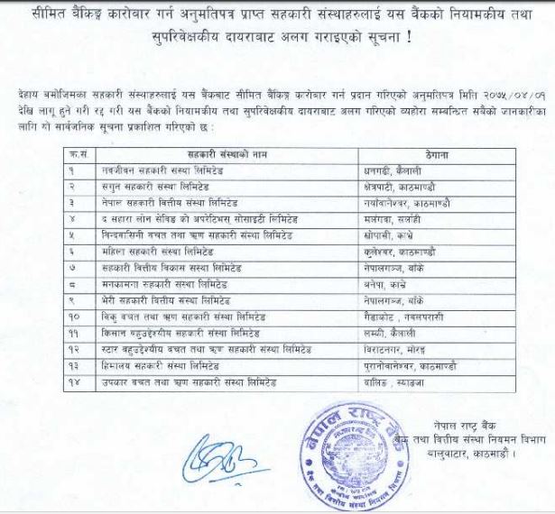 सीमित बैंकिङ कारोबार अनुमति रद्द भएसँगै यी १५ वटा सहकारीलार्इ राष्ट्र बैंकले नियमन तथा सुपरिवेक्षण गर्नेछैन ।