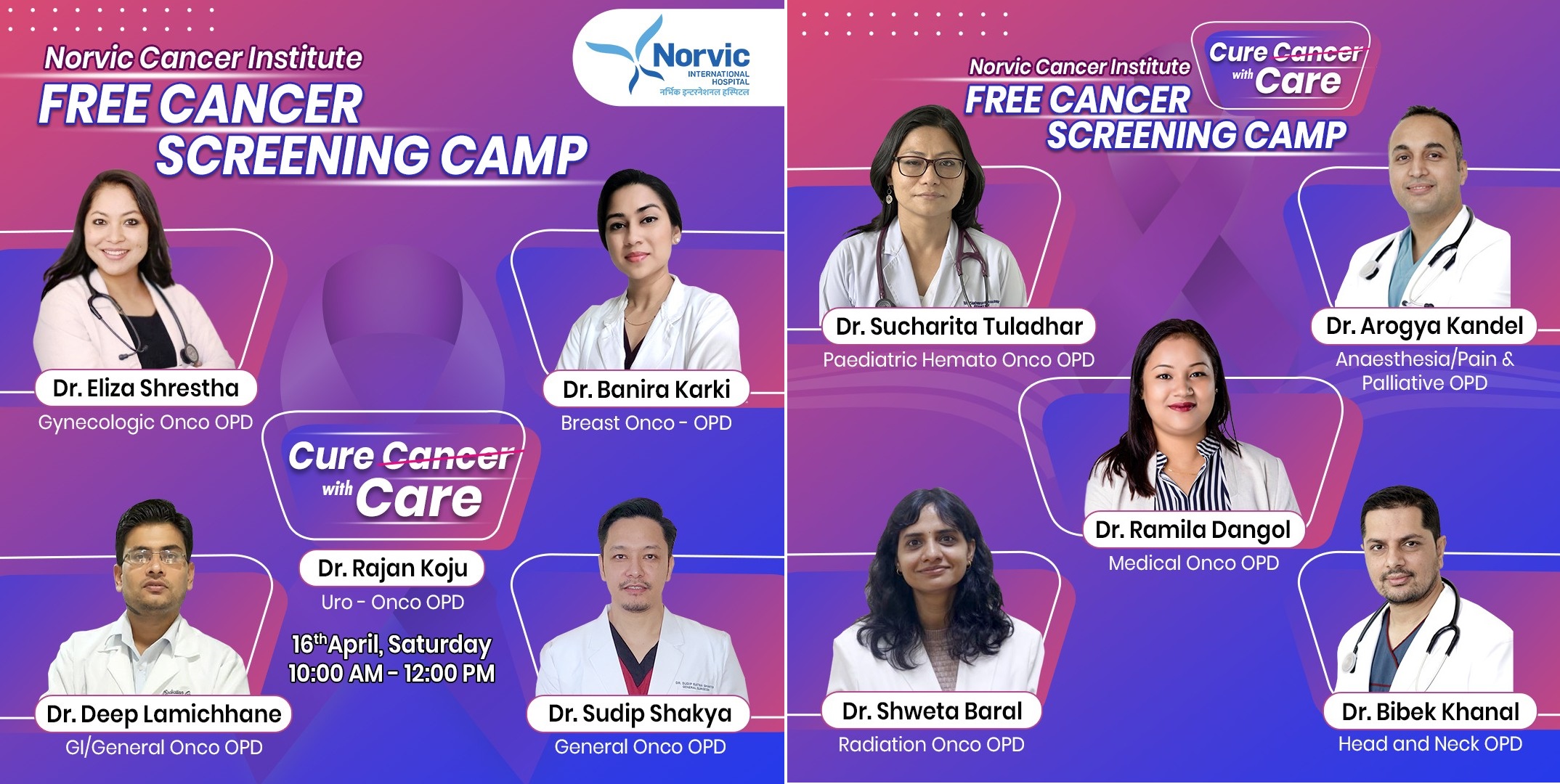 क्यान्सरसँग सम्बन्धित १० जना विशेषज्ञ डाक्टरहरुलाई एकैपटक फ्री क्याम्पमा उतारिने अस्पतालका प्रमुख कार्यकारी अधिकृत अजयकुमार मिश्रले जानकारी दिए । क्याम्पमा क्यान्सरसँग सम्बन्धित विशेषज्ञ चिकित्सकहरु डा. एलिजा श्रेष्ठ, डा.बानिरा कार्की, डा. दीप लामिछाने, डा. सुदीप शाक्य, डा. सुचित्रा तुलाधार, डा. आरोग्य कँडेल, डा. रमिला डंगोल, डा.श्वेता बराल र डा. विवेक खनालको सहभागिता रहनेछ ।