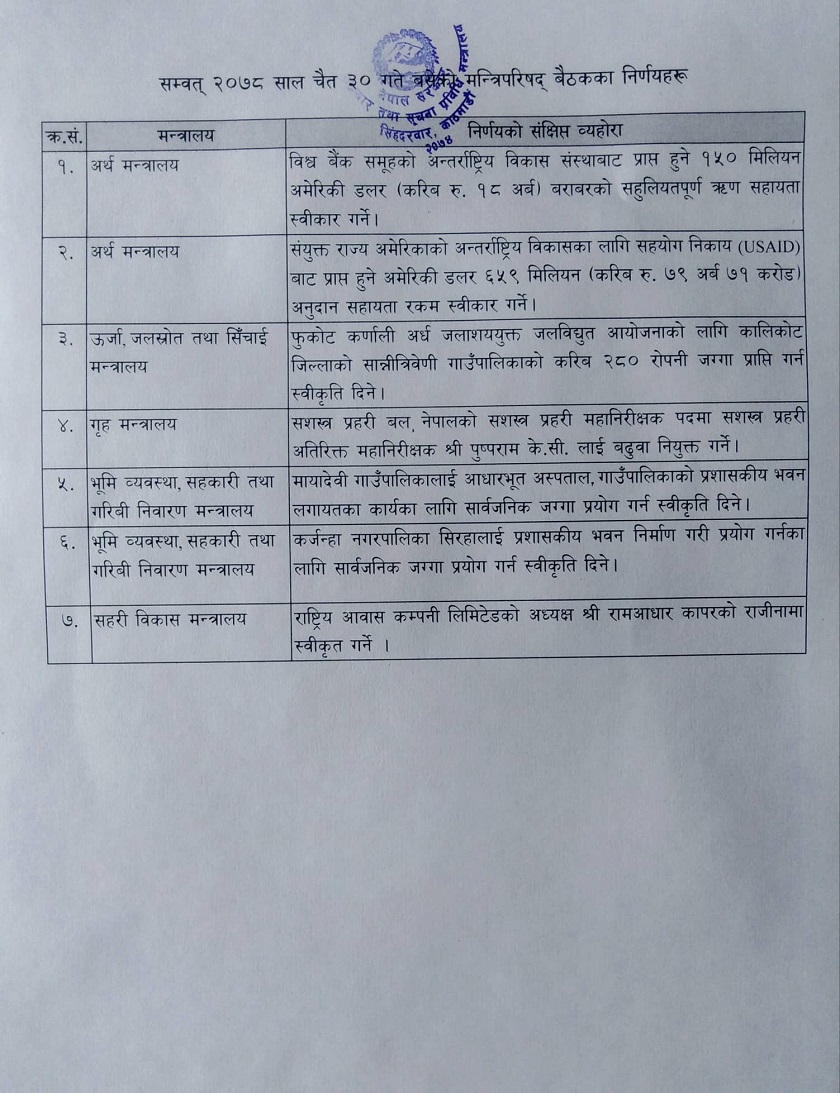 त्यस्तै राष्ट्रिय आवास कम्पनी लिमिटेडको अध्यक्ष रामआधार कापारको राजीनामा स्वीकृत गर्ने पनि मन्त्रिपरिषद् बैठकको निर्णय रहेको छ ।