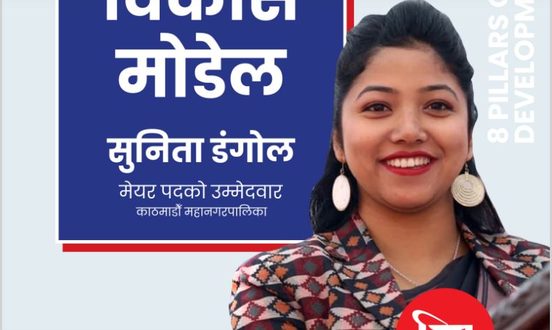 काठमाडौं । आगामी स्थानीय तहको निर्वाचनमा काठमाडौं महानगरपालिकाबाट मेयरको उम्मेदवार बन्न लागेकी सुनिता डंगोलले आफ्नो चुनावी घोषणापत्र सार्वजनिक गरेकी छिन् । आगामी निर्वाचनमा काठमाडौं महानगरबाट मेयरको उम्मेदवार बन्ने घोषणा गरेकी डंगोलले ८ खम्बे विकासको मोडलसहित घोषणापत्र सार्वजनिक गरेकी हुन् ।
