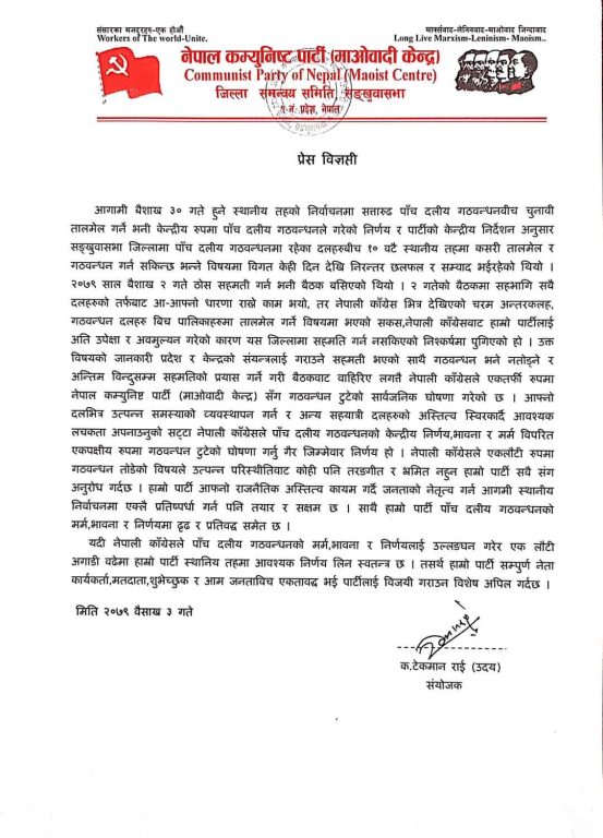 ‘२ बैशाखको बैठकमा सहभागी सबै दलको तर्फवाट आ–आफनो धारणा राख्ने काम भयो तर नेपाली कांग्रेसभित्र देखिएको चरम अन्तरकलह, गठबन्धन दलहरूबीच पालिकाहरूमा गर्ने विषयमा भएको सकस र कांग्रेसबाट हाम्रो पार्टीलाई अति उपेक्षा र अबमुल्यन गरेको कारण यस जिल्लामा सहमति गर्न नसकिएको निष्कर्षमा पुगिएको हो,’ राईले प्रेस विज्ञप्ति जारी गर्दै भनेका छन्, ‘उक्त विषयको जानकारी प्रदेश र केन्द्रको संयन्त्रलाई गराउने सहमति भएको साथै गठबन्धन भने नतोड्ने र अन्तिम विन्दुसम्म सहमतिको प्रयास गर्ने गरी बैठकबाट बाहिरिएलगत्तै कांग्रेसले एकतर्फी रुपमा माओवादीसँग गठबन्धन टुटेको घोषणा गरेको छ ।’