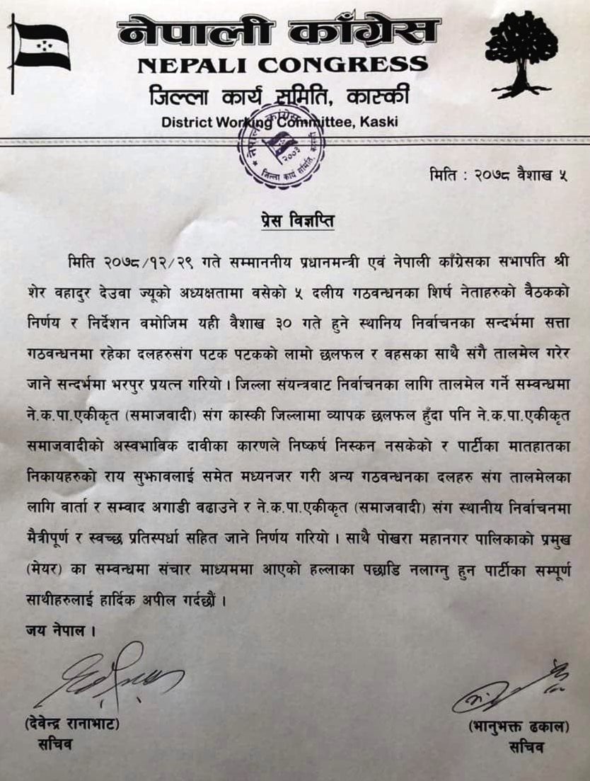 सचिवद्वय भानुभक्त ढकाल र देवेन्द्र रानाभाटले संयुक्त विज्ञप्ति जारी गरेर पोखरा महानगर पालिकाको प्रमुख (मेयर) का सम्बन्धमा सञ्चार माध्यममा आएको हल्लाका पछाडि नलाग्न पार्टीपंक्तिलाई आह्वान गरेका छन् । कांग्रेसले पोखराको मेयर आफैंले पाउनुपर्ने अडान राख्दै आएको छ । यसकै लागि जिल्ला नेतृत्वले केन्द्रीय नेताहरूसँग समेत भेटघाट गरेर फर्किएका छन् ।