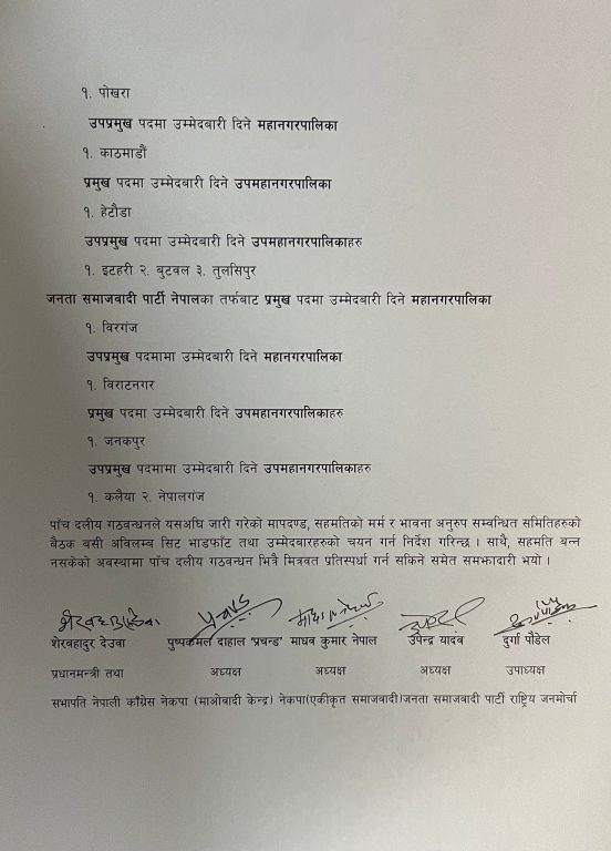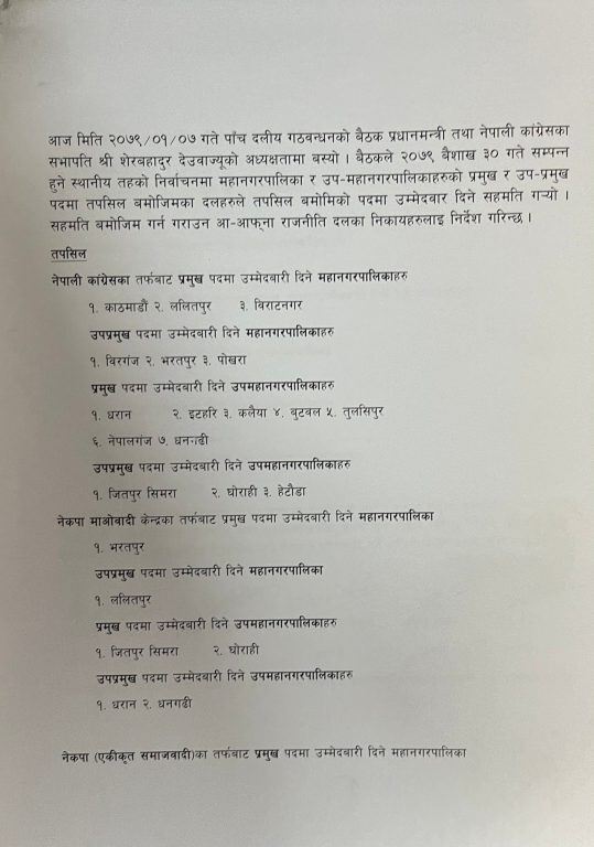 काठमाडौं । सत्तारुढ दलबीच स्थानीय तह निर्वाचनमा सबै पालिकामा गठबन्धन गर्ने सहमति भएको छ ।