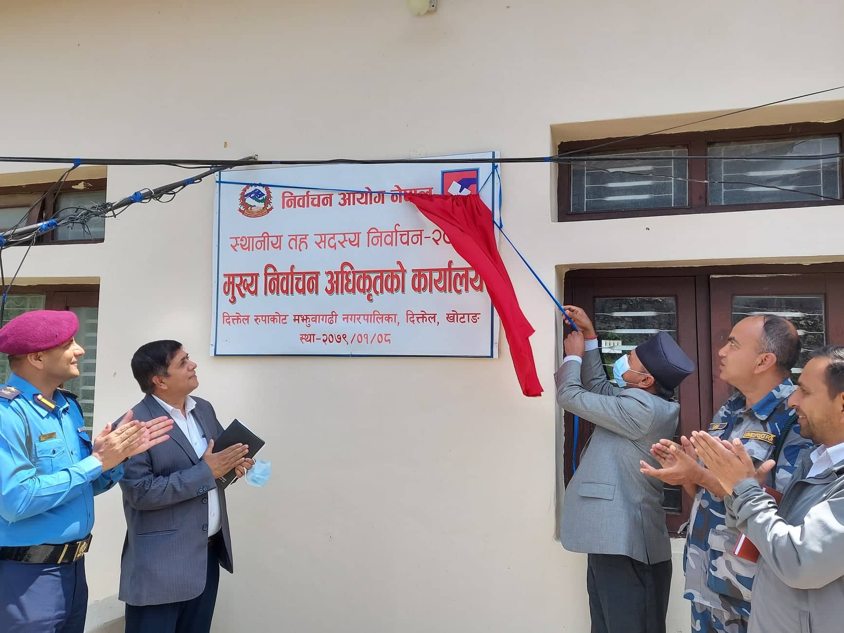 मुख्य निर्वाचन अधिकृतको कार्यालय उद्घाटनका क्रममा प्रमुख जिल्ला अधिकारी फणिन्द्र दाहाल, जिल्ला निर्वाचन अधिकारी राजेश गौतम, जिल्ला प्रहरी कार्यालयका डिएसपी उमेश लम्साल, सशस्त्र प्रहरी हलेसी गुल्मका डिएसपी सरोज कार्की, नेपाल पत्रकार महासंघका अध्यक्ष दिलीप खत्री लगायतको उपस्थिति रहेको थियो । बिहीबार एकैसाथ जिल्लाका १० वटै स्थानीय तहमा निर्वाचन अधिकृतको कार्यालय स्थापना गरिएको मुख्य निर्वाचन अधिकृत एवं जिल्ला न्यायाधीश आचार्यले जानकारी दिए ।