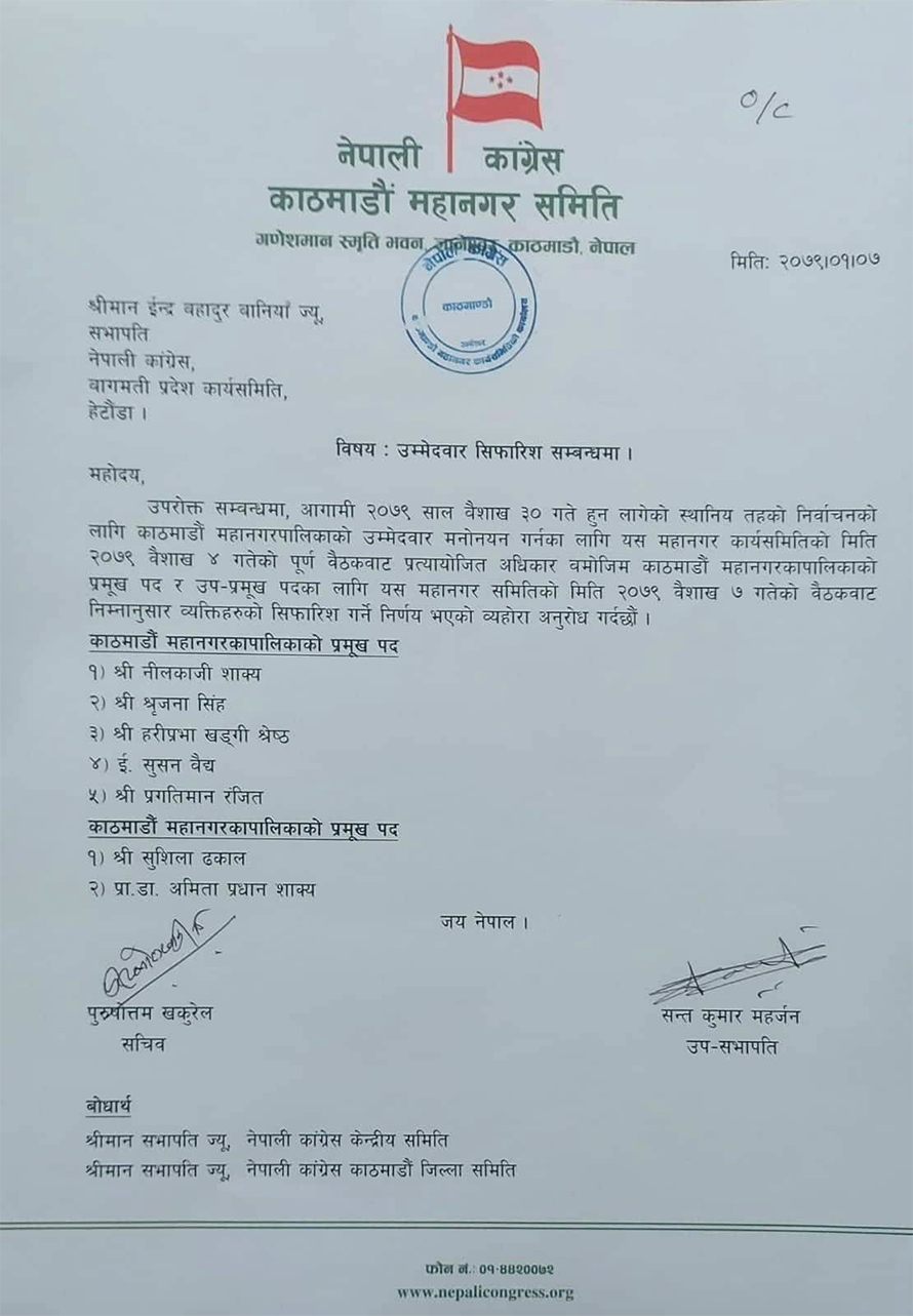 कांग्रेसबाट काठमाडौंमा मेयरका लागि सिंहसहित ५ जनाको नाम सिफारिस (निर्णयसहित)