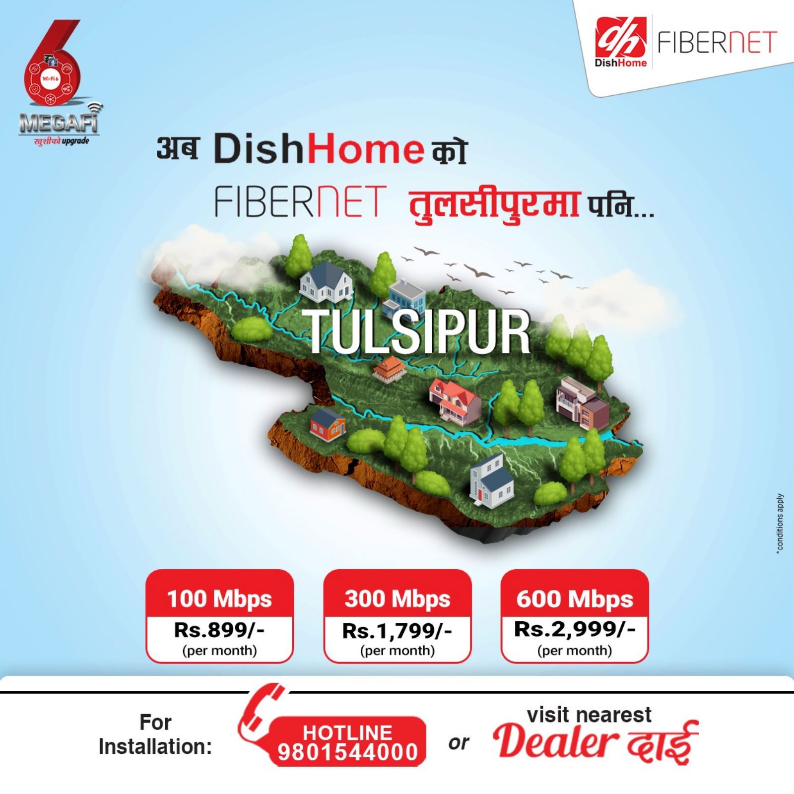 समग्र नेपालमा पुग्ने लक्ष्य लिएको डिशहोम फाइबरनेट हाल तुलसीपुर, दाङ्गमा सुरुवात भएको छ र छिटै नेपालका अन्य स्थानमा पनि पुग्दै छ । डिसहोम फाइबरनेटका साथमा उत्कृष्ट इन्टरनेट कनेक्सनको अनुभवसहित, डिशहोमका ग्राहकहरुका लागी डिस टिभीको निःशुल्क सदस्यता, आकर्षक छुटहरु, निःशुल्क डिसहोम GO App र XVOD जस्ता विभिन्न सुविधाहरु उपलब्ध छन् । फाइबरनेटका योजनाहरु १० Mbps देखि ६०० Mbps सम्म उपलब्ध छन् ।