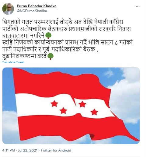 तत्कालीन कांग्रेस महामन्त्री पूर्णबहादुर खड्काले पार्टीको औपचारिक बैठक अब प्रधानमन्त्रीको सरकारी निवास बालुवाटारमा नबस्ने जानकारी दिँदै ट्वीट गरेका थिए ।