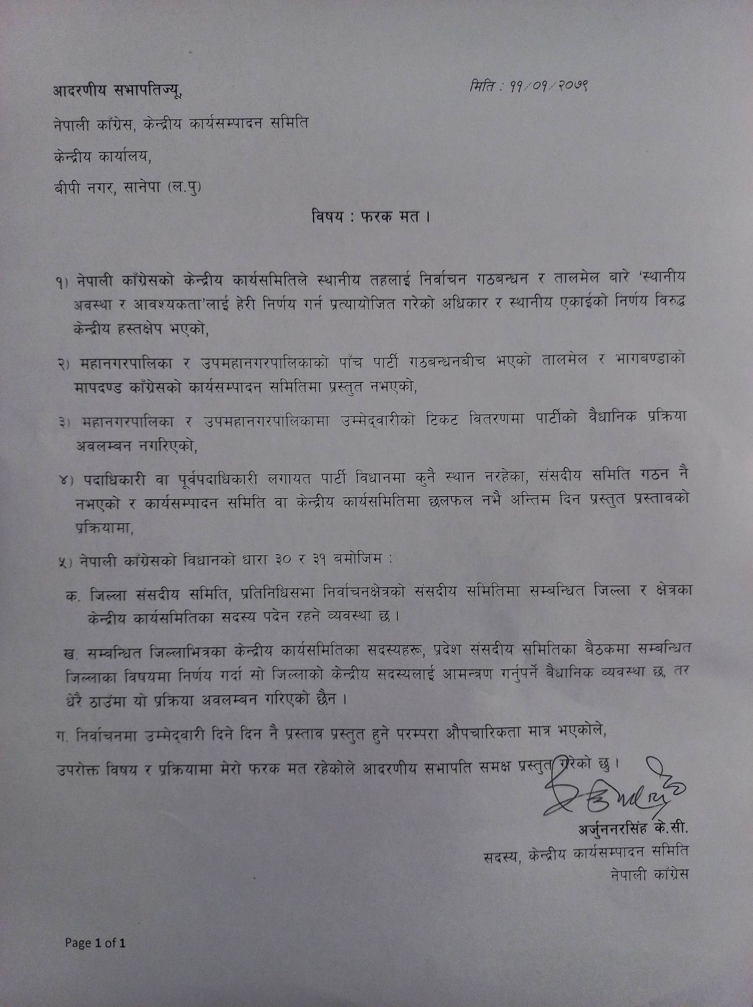काठमाडौं । नेपाली कांग्रेसका केन्द्रीय सदस्य अर्जुननरसिंह केसीले केन्द्रीय कार्यसम्पादन समितिको बैठकमा आफ्नो ५ बुँदे फरक मत राखेका छन् ।