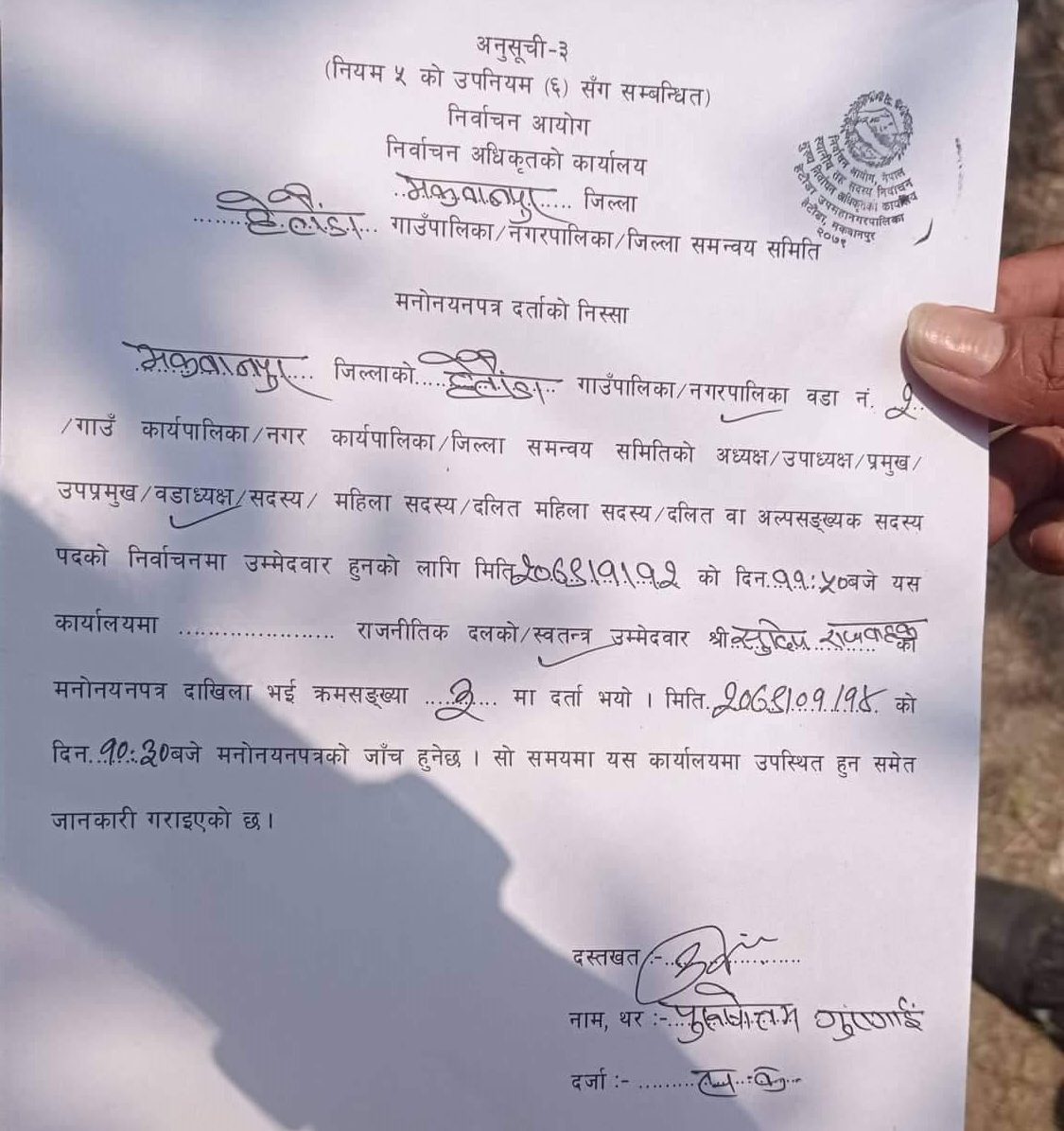 हेटौंडा । मकवानपुरको हेटौंडा उपमहानगरपालिका वडा नम्बर २ मा नेपाली कांग्रेसका नेता सुदिप राजवाहकले बागी उम्मेदवारी दिएका छन् । आज निर्वाचन अधिकृतको कार्यालय हेटौंडामा गएर उनले बागी उम्मेदवारी मनोनयन दर्ता गराएका हुन् ।