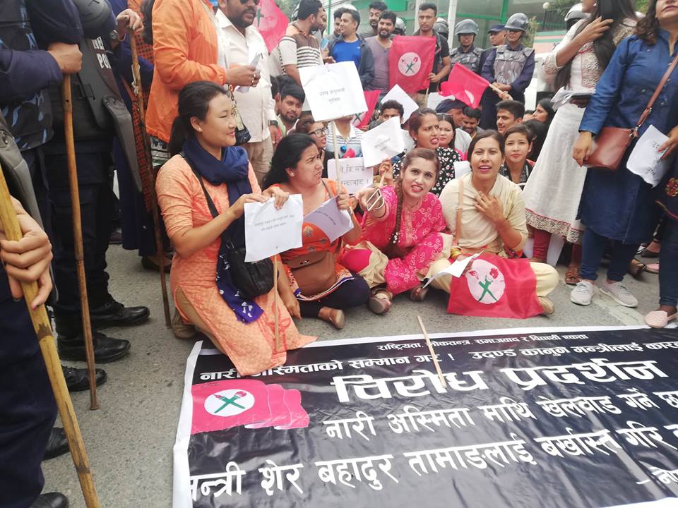 मन्त्रीको यो अभिव्यक्तिले नारी अस्मिताको धज्जी उडाएको जनाउँदै नेविसंघले कानुनमन्त्रीको राजीनामा माग्दै प्रधानमन्त्री निवास बालुवाटारमा धर्ना दिएको हो ।