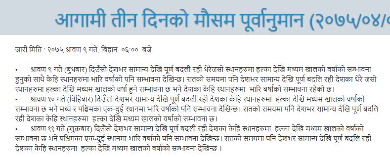 काठमाडौं : जल तथा माैसम पूर्वानुमान महाशाखाले अाज मुलुकका केही स्थानमा भारी बर्षा हुने पूर्वानुमान गरेको  छ।