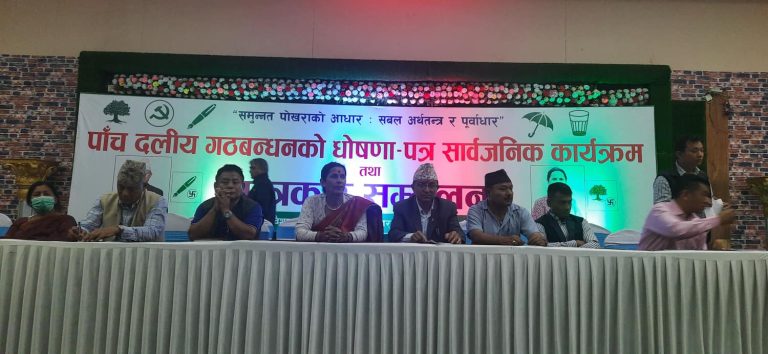 पोखरा । सत्तारूढ गठबन्धन पोखराले आसन्न स्थानीय तह निर्वाचनका लागि चुनावी घोषणापत्र सार्वजनिक गरेको छ । पोखरामा बिहीबार आयोजित पाँचदलीय गठबन्धनको घोषणापत्र सार्वजनिक कार्यक्रममार्फत साझा चुनावी घोषणापत्र सार्वजनिक गरिएको हो ।