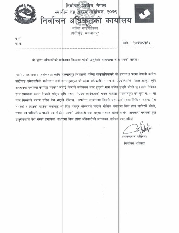 अधिकारी विरुद्ध हाल राष्ट्रिय कृषि जनगणना गणकमा कार्यरत रहेको भन्दै मनोनयन बदर हुनुपर्ने मागसहित उजुरी परेको थियो । उजुरी परेपछि अधिकारीले लिखित जवाफ पेस नगरेको र उनको पार्टीका तर्फबाट दिलबहादुर भोम्जनको मौखिक बयानमा उनी हाल जागिरमै रहेको भनिएकाले उम्मेदवारी बदर गरिएको निर्वाचन अधिकृतको कार्यालय बकैयाका निर्वाचन अधिकृत आनन्दराज पोखरेलले जानकारी दिए ।