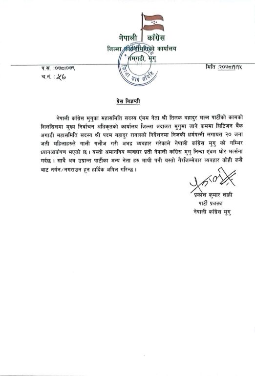 वैशाख ३० गतेको स्थानीय चुनावका विषयमा मुख्य निर्वाचन अधिकृतको कार्यालय मुगुमा पार्टीको काम विशेषले जाँदा सिटिजन्स बैंक लिमिटेड मुगुको कार्यालय अगाडि कांग्रेस मुगुका महासमिति सदस्य पदम रावलकि धर्मपत्नी तथा दर्जन भन्दा बढी महिलाले महासमिति सदस्य मल्ल लाई गाली गलौजका साथ अभद्र व्यवहा गरेको कांग्रेस मुगुका प्रवत्ता प्रकाश शाहीले विज्ञप्ति जारी गरि जानकारी दिएका छन् ।