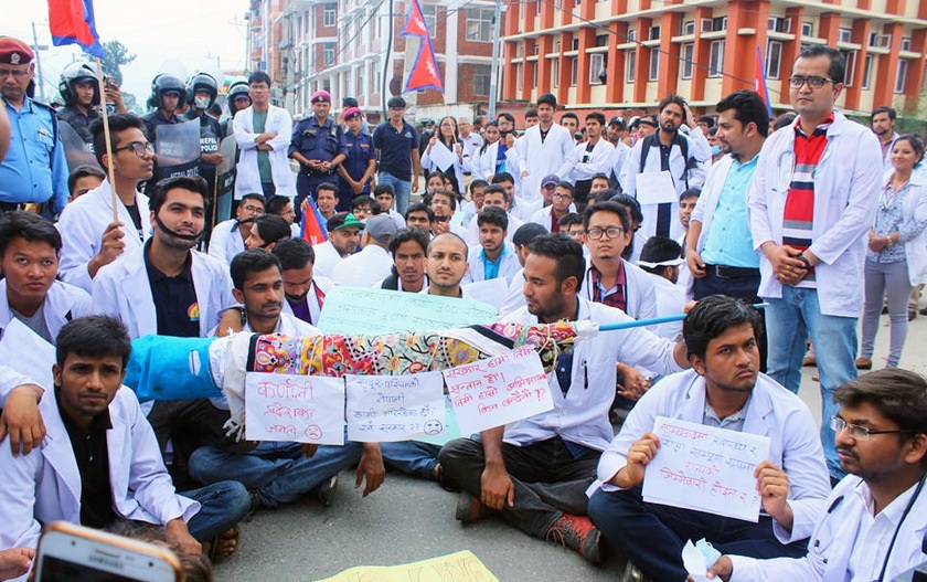 चिकित्सक तथा स्वास्थ्यकर्मीहरुले ‘सरकार हामी तिम्रो सन्तान हौं, तिमी हाम्रो अभिभावक किन बन्दैनौं ?’ जस्ता लेखिएका प्लेकार्ड बोकेर नाराबाजी गर्दै हिडेका थिए ।