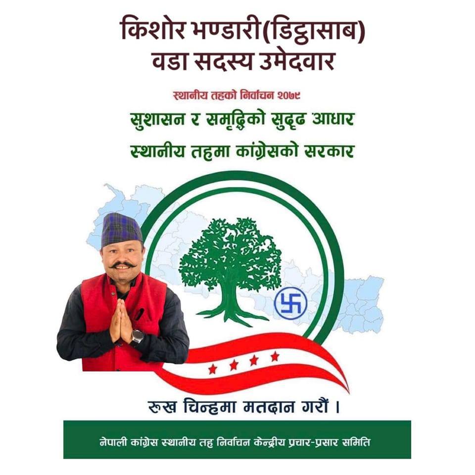 काठमाडौं । डिठ्ठा साहेबले परिचिति कलाकार किशोर भण्डारी नेपाली कांग्रेसका उम्मेदवार भएका छन । ३० वैशाखमा हुन गईरहेको स्थानीय तहको निर्वाचनका लागि कलाकार भण्डारीले आफनो उम्मेदवारी दर्ता गराएका हुन ।