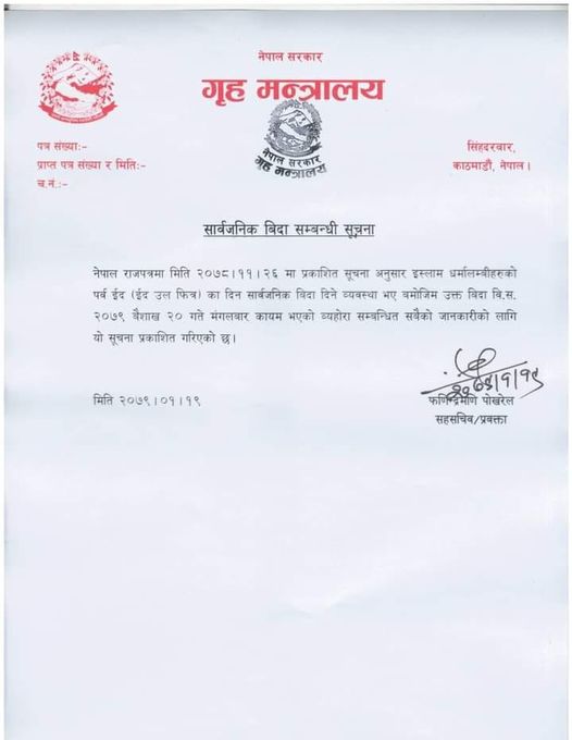 सरकारले इस्लाम धर्मालम्वीहरुको पर्व ईद (ईद उल फित्र)को अवसरमा सार्वजनिक बिदा दिएको हो । २०७८ फागुन २६ गते राजपत्रमा प्रकाशित सूचनाअनुसार सार्वजनिक बिदा दिएको गृह मन्त्रालयले जनाएको छ ।
