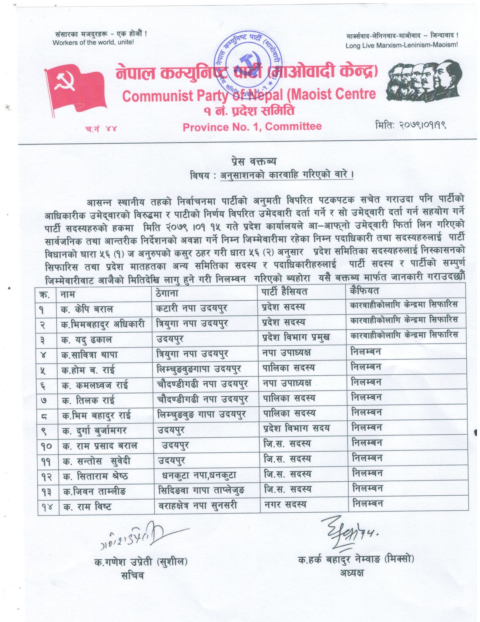 नेकपा माओवादी केन्द्र प्रदेश नम्बर १ कमिटीले बागी उम्मेदवारी दिने तथा फिर्ता नलिने १४ जनालाई कारबाही गरेको छ। पार्टीको निर्देशन र नीति विपरित जाने उनीहरुलाई पार्टीले अनुशासनको कारबाही गरेको हो ।