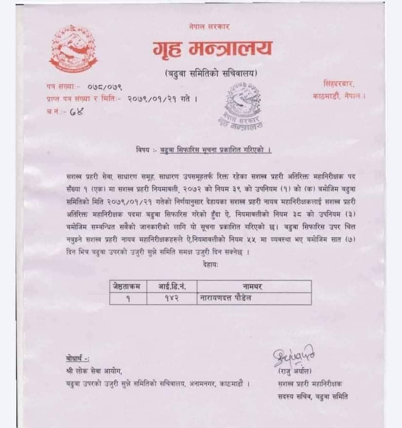 बढुवा समितिको बुधबार बसेको बैठकले उनलाई सिफारिस गरिएकोबारे एक सूचनामार्फत जानकारी गराइएको छ ।