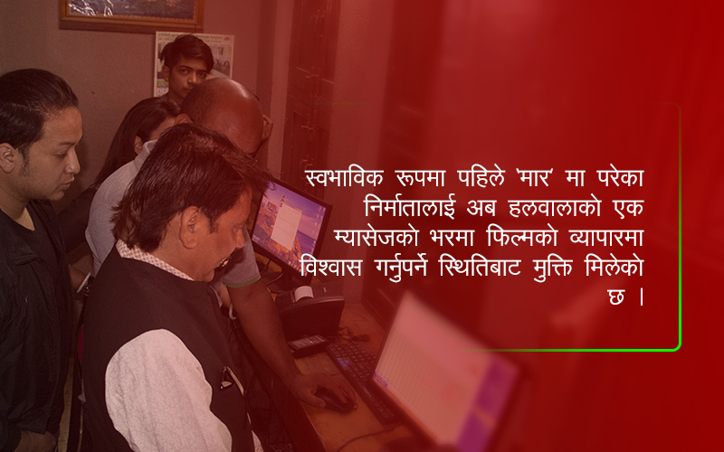 ‘बक्स अफिस कस्तो होला भन्ने धेरैमा खुल्दुली पनि छ, अहिलेको सिस्टमले निर्माताले आफ्नो पिल्मले कुन हलबाट कति कमायो भन्ने प्रत्यक्ष जानकारी दिन्छ, निर्माताले हरेक दिन आफ्नो फिल्मले गरेको व्यापार डाउनलोड गरेर हेर्न सक्नुहुन्छ ।’, अधिकारीले बताए ।