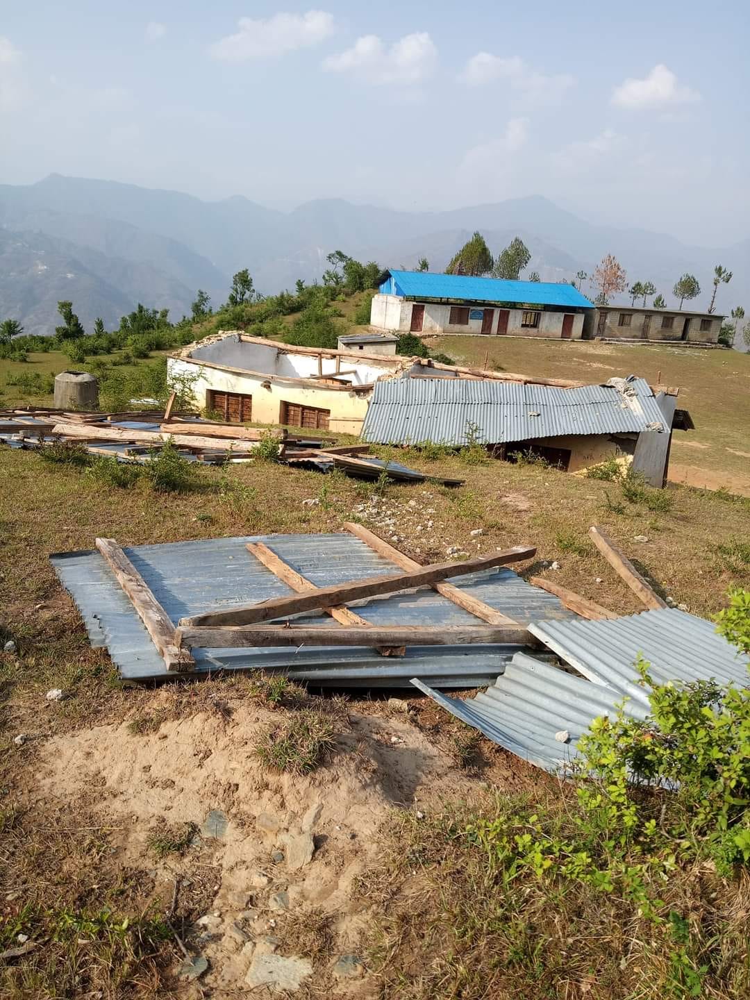 बैतडी । बुधबाराति आएको हावाहुरीले बैतडीको पुर्चौडी नगरपालिका-७ ऐरीगाउँ दलित टोलमा रहेको लटिनाथ आधारभुत बिद्यालयको छानो उडाएको छ । बर्षासँगै आएको हावाहुरीले उक्त विद्यालयको दुई कोठाको जस्तापाता उडाएको हो ।