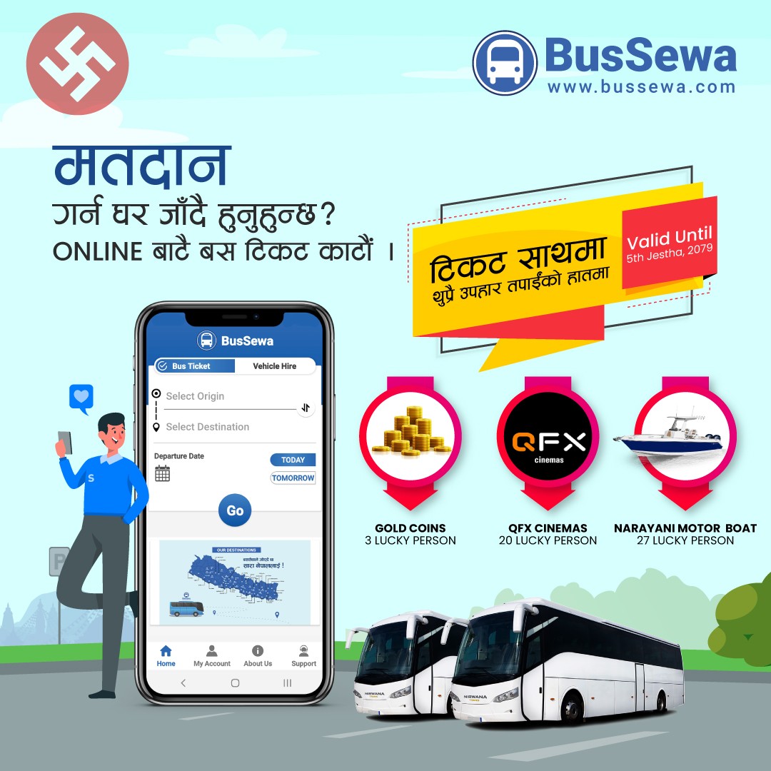 काठमाडौं । वैशाख ३० गते हुने स्थानीय तहको निर्वाचनमा मतदानका लागि जाने यात्रुलाई लक्षित गर्दै बस सेवाले विशेष अफर सार्वजनिक गरेको छ । अफर अन्र्तगत बस सेवा डटकम मार्फत अनलाइन टिकट बुकिङ गर्ने यात्रुले सुनको असर्फी जित्न सक्नेछन् ।