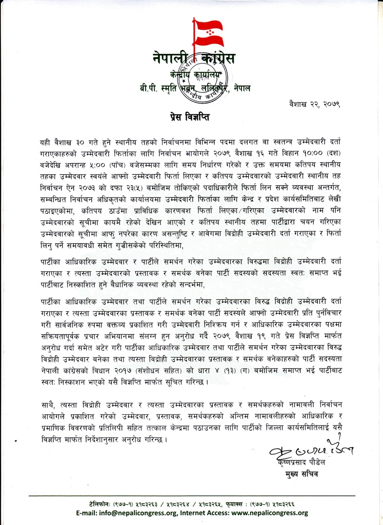 काठमाडौं । नेपाली कांग्रेसले पार्टीका आधिकारिक उम्मेदवार तथा पार्टीले समर्थन गरेका उम्मेदवारका विरुद्ध बागी दिएका तथा उनीहरुका प्रस्ताव तथा समर्थकहरु पार्टीबाट स्वतः निष्कासन भएको जनाएको छ।