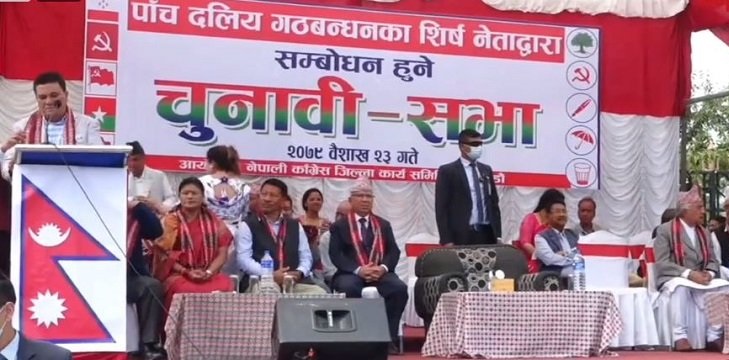 सभालाई पाँच दलिय गठबन्धनमा रहेका नेपाली कांग्रेस, नेकपा (माओवादी केन्द्र), नेकपा (एकीकृत समाजवादी), जनता समाजवादी पार्टी, नेपाल र राष्ट्रिय जनमोर्चाका शिर्ष नेताले सम्बोधन गर्दैछन् ।