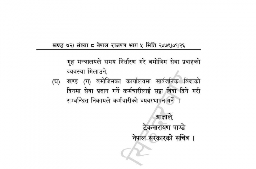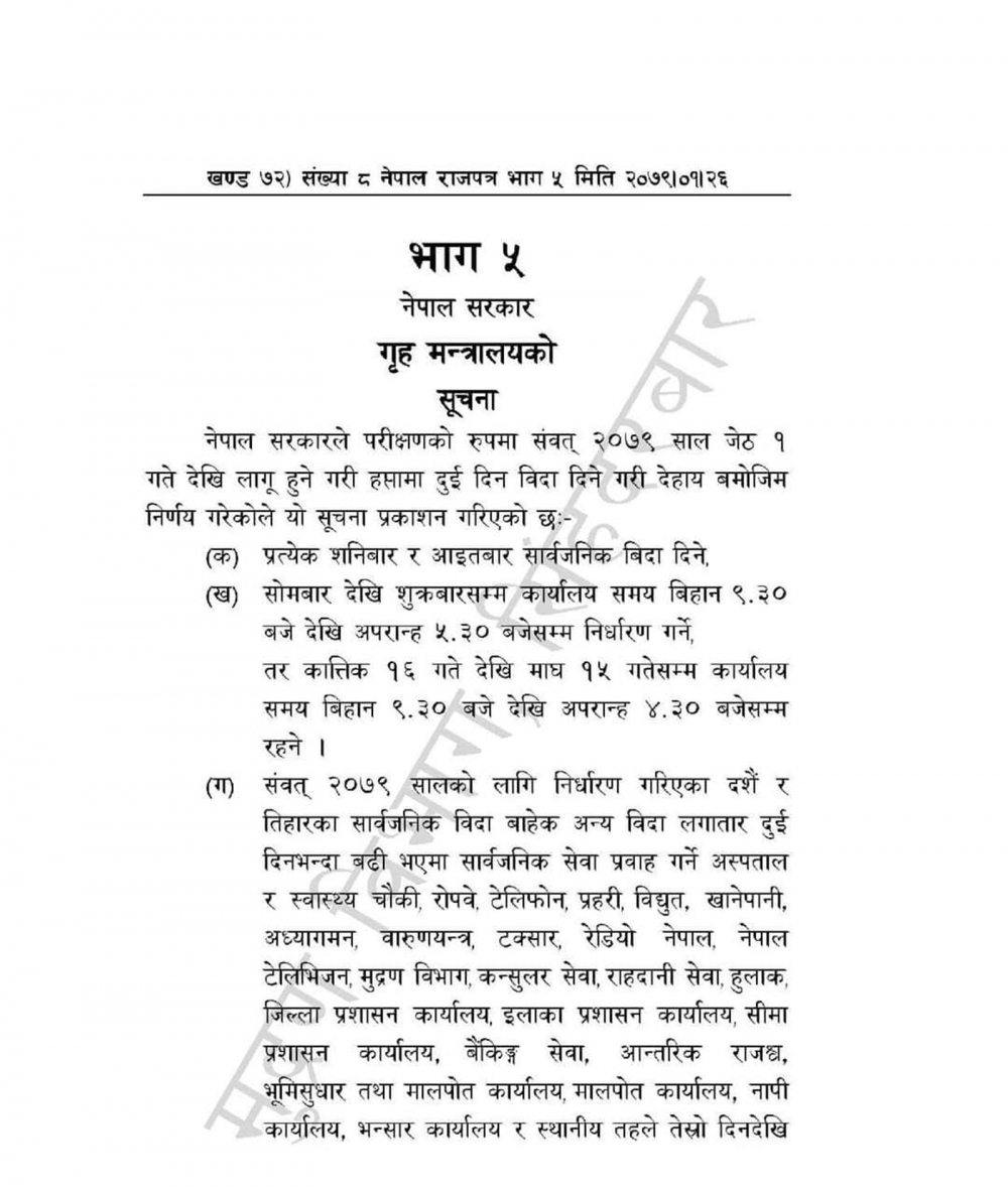 जेठ १ गतेदेखि शनिबार र आइतबार बिदा दिने निर्णयलाई गृहमन्त्रालयले राजपत्रमा प्रकाशित गरेको हो ।