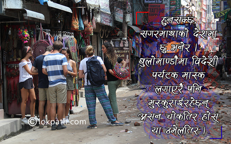 तर नेपालका पर्यटकीय स्थलहरु अझैपनि स–साना पूर्वाधारहरुको विकासमा अल्मलिएको छ । आफ्नो बिदाको सदुपयोग गर्न नेपाललाई गन्तव्य बनाएर आएका पर्यटकहरु मास्क लगाएर घुम्नुपरेको छ । तर खुसीको कुरा, उनीहरु सगरमाथाको देशमा आउन पाएर होला मास्क लगाएरै पनि मुस्कुराईरहेछन्, असन चोकतिर होस् या ठमेलतिर । ( फोटो फिचर )