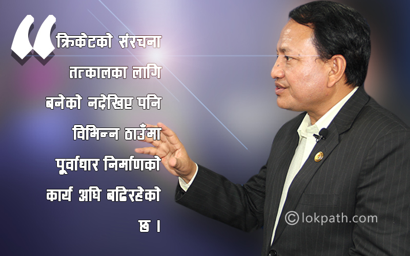 ‘दक्षिण एशियाली खेलकुद ‘साग’ लाई मध्यनजर गर्दै कीर्तिपुर क्रिकेट मैदानको स्तरोन्नती र प्याराफिट निर्माणको कामलाई चाँडै सम्पन्न गर्ने लक्ष्य रहेको छ ।’ उनले लोकपथलाई भने ।