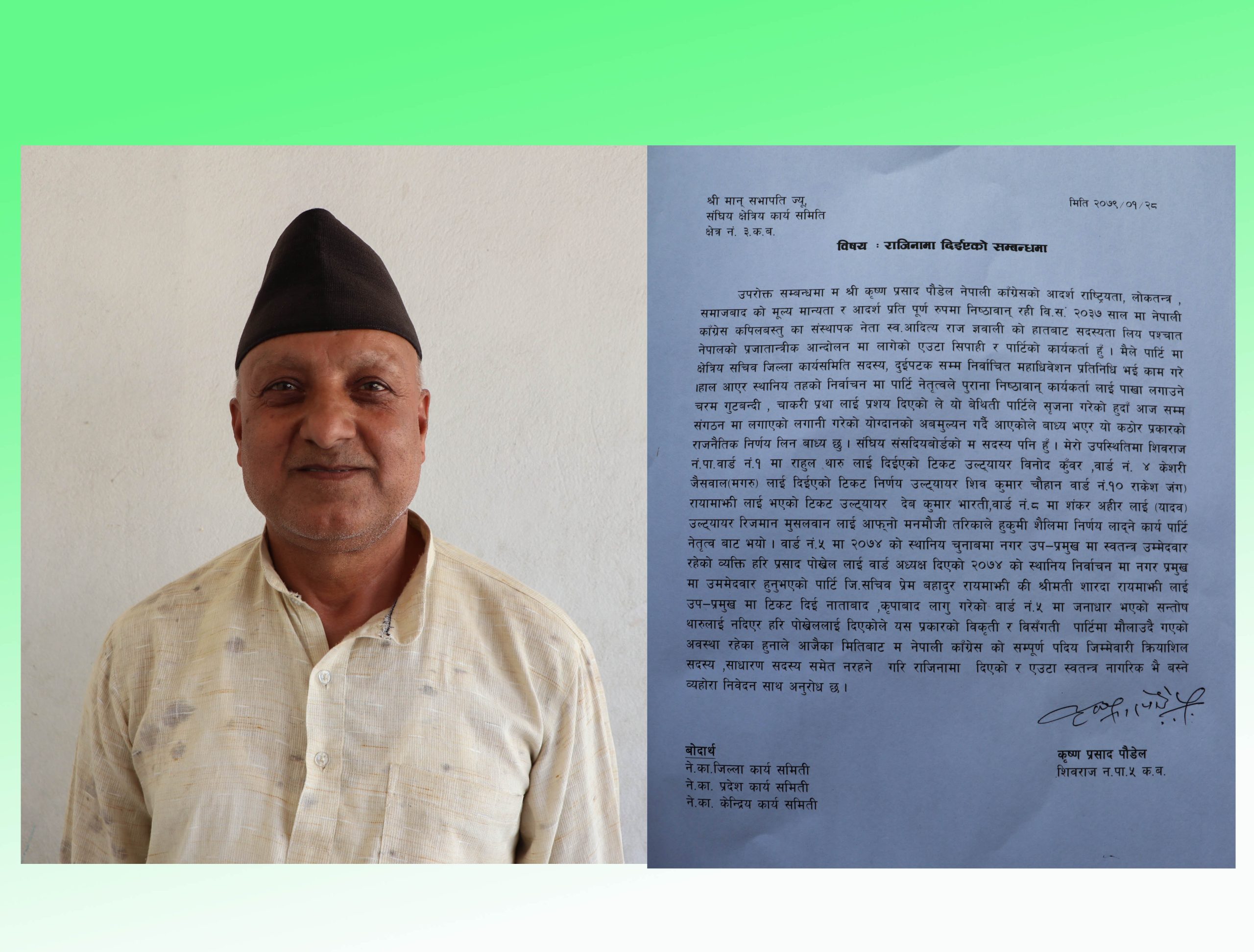 कपिलवस्तु । नेपाली कांग्रेसका महाधिवेशन प्रतिनिधि तथा संसदीय बोर्ड टिकट वितरण समितिको सदस्यसमेत रहेका कपिलवस्तुका कृष्णप्रसाद पौडेलले पार्टीबाट राजीनामा दिएका छन् ।