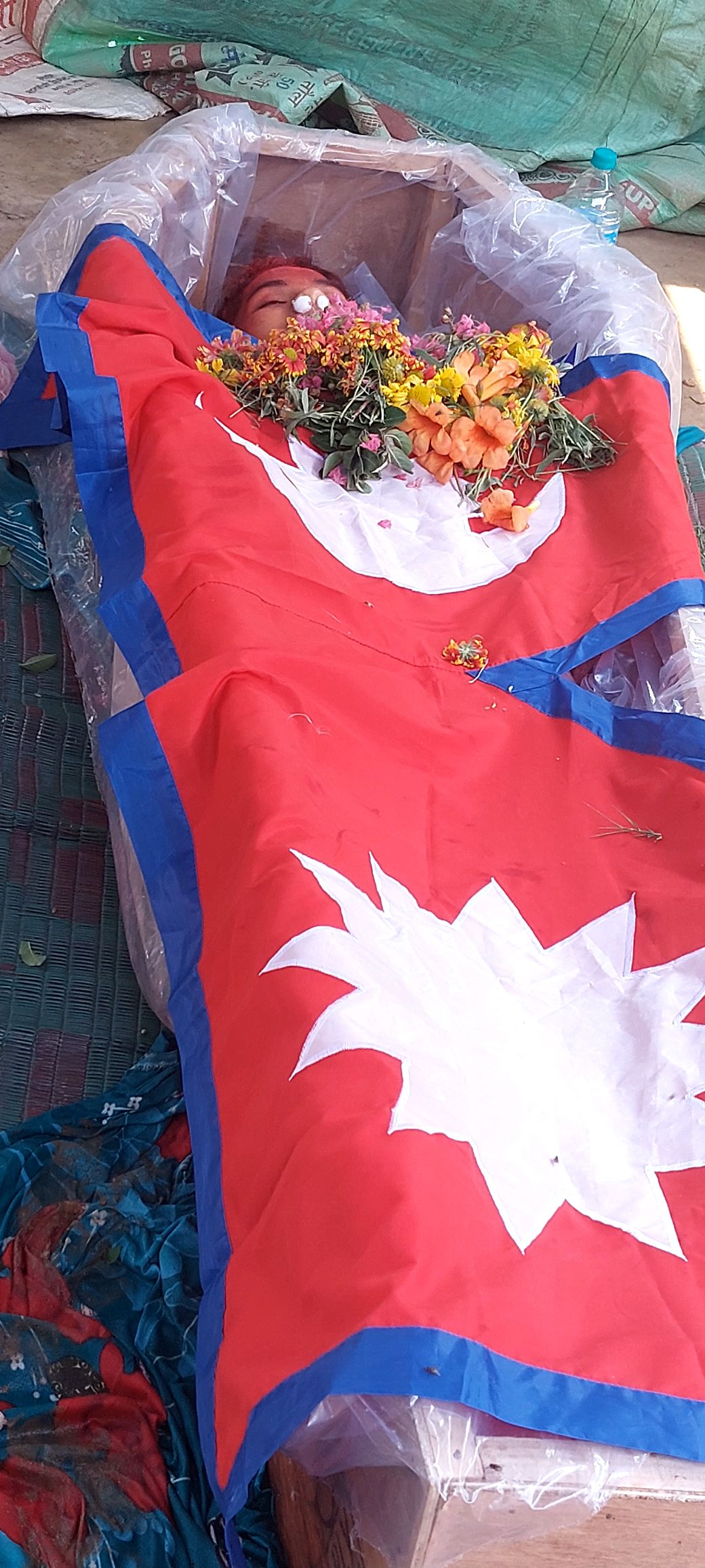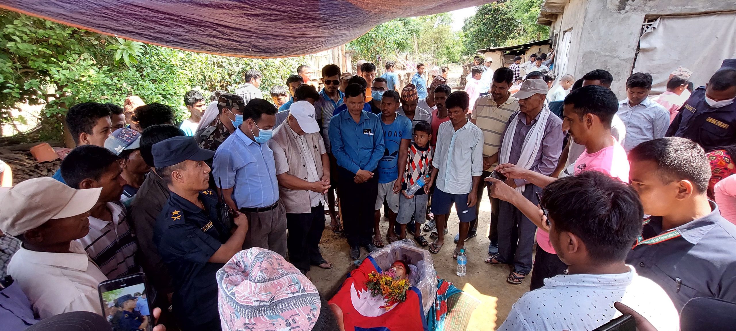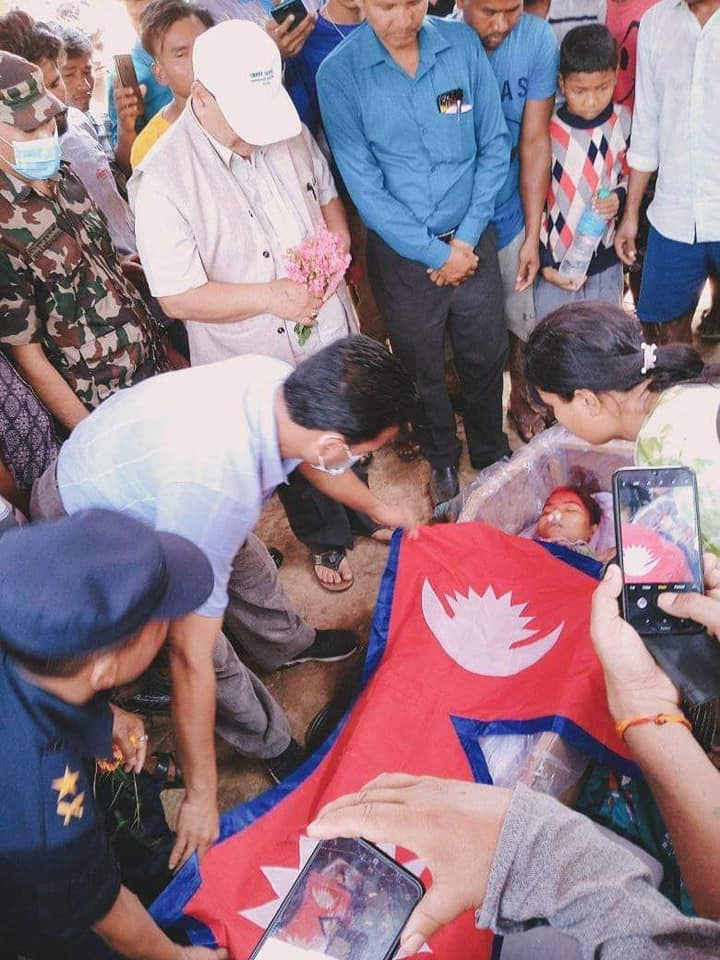 कोहलपुर । भारोत्तोलन खेलाडी सन्जु चौधरीको पार्थिव शरीरमा युवा तथा खेलकुद मन्त्री महेश्वर गहतराज (अथक) ले राष्ट्रिय झण्डा ओढाएर सम्मान व्यक्त गरेका छन् ।