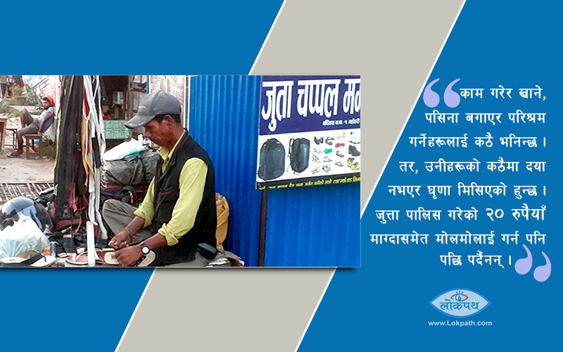 पुराना, मक्किएका, च्यातिएका जुत्ता पालिस गरेर टिलिक्क टल्काउनु उनको दैनिकी पेसा हो । उनलाई चुनावी माहोलले अझै छोएको छैन ।
