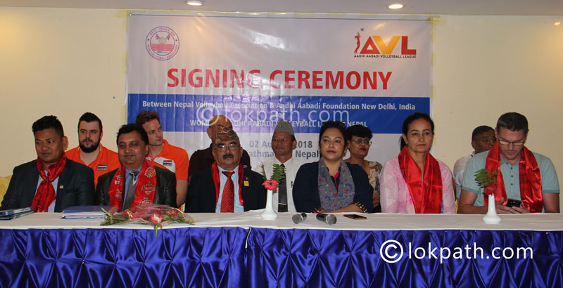 नेपाल भलिबल संघका अध्यक्ष मनोरञ्जन रमण शर्मा र आधिआबादी फाउन्डेशनका प्रमुख कार्यकारी अधिकृत यशकुमार सिंहबीच सम्झौता पत्रमा हस्ताक्षर गरेका थिए ।