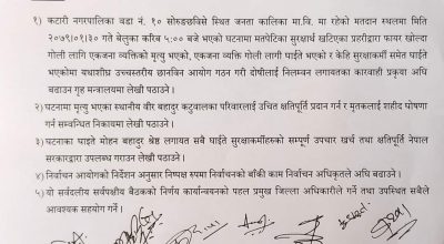 उदयपुर । उदयपुरको कटारी नगरपालिका– १० सोरुङछबिसेस्थित जनता कालिका माध्यामिक विद्यालयमा मतपेटीका सुरक्षार्थ खटिएका प्रहरीले चलाएको गोलीबाट मृत्यु भएपछि उत्पन्न तनाबमा ५ बुँदे सहमति भएको छ । कटारी नगरपलिकास्थित निर्वाचन अधिकृतको कार्यालयमा भएको राजनीतिक दल, उम्मेदवार तथा जिल्लास्थित सुरक्षा समितिसँग भएको सर्वदलीय बैठकले ५ बुँदे सहमति गरेको हो ।