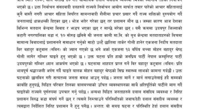 विज्ञप्तिमा सरकारद्वारा परिचालित प्रशासनले निर्दोष मतदातालाई छातिमा गोली हानेर हत्या गर्नुले कानुनी राज्यलाई नै धज्जी उडाएको बताइएको छ । एमालेले घटनाको यर्थात जनता सामु ल्याउन र मृतक परिवारलाई व्यवस्थापन गर्दै क्षतिपूर्ति उपलब्ध गराउन माग गरेको छ । विज्ञप्तिमा घाइतेको स्वास्थ्य उपचार खर्च व्यहोर्न, क्षतिपूर्ति उपलब्ध गराउन र गोली हान्ने मतियारलाई अबिलम्ब कानुनी कारबाही गर्न समेत माग गरिएको छ ।